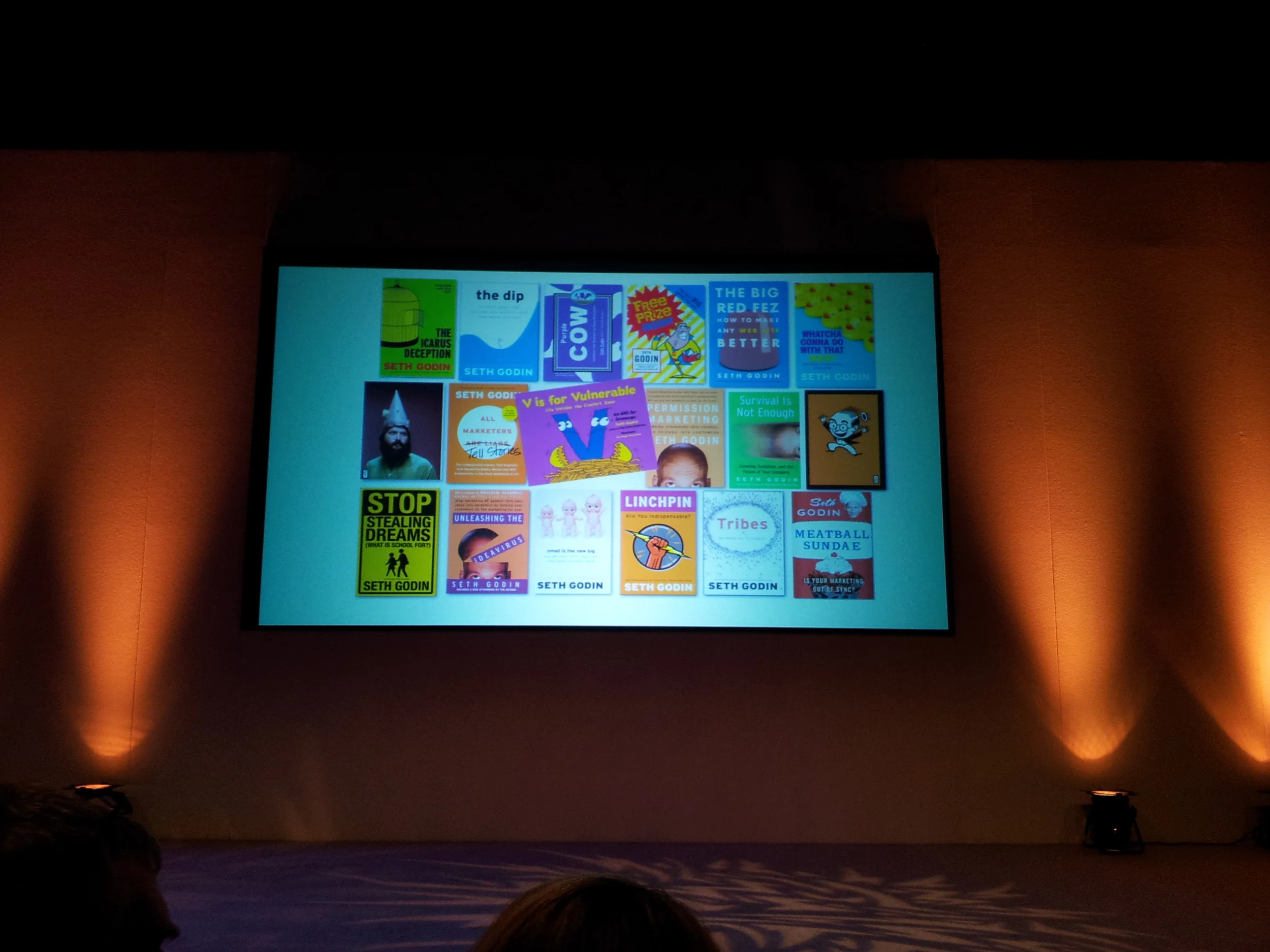 Zapínání počítače a prezentace se Seth vyhnul velmi efektivně. Při vstupu do sálu byl na plátně slide s fotkou všech jeho knih najednou. Žádné „Seth Godin live“ apod. – jen jeho knížky. Jak přišel, pustil rovnou další slide. Do toho Bob Marley. Přesně to je potřeba se naučit. Prezentace nesmí být „vidět“ – vaše příběhy jsou důležitější než vaše slidy. A váš business ať je i trochu show business.